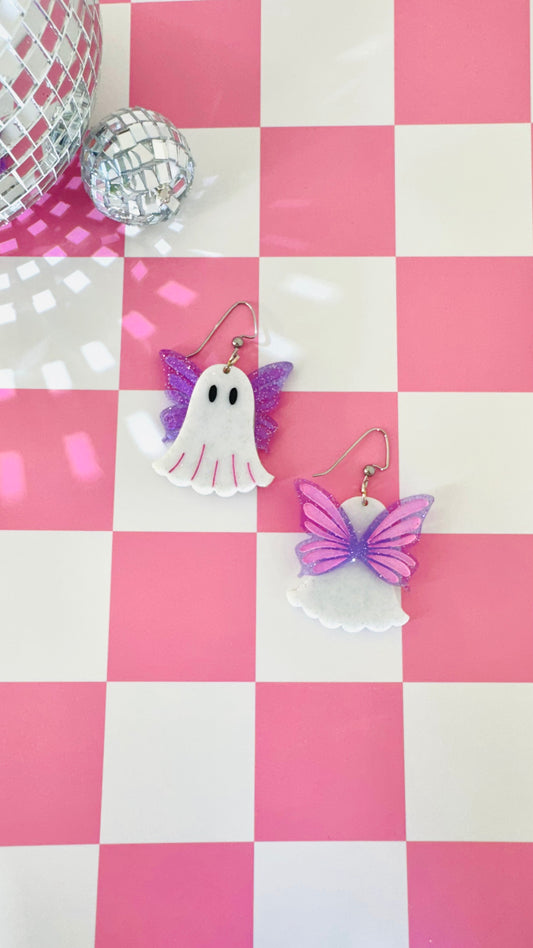 Fairy Ghost Earrings – Sparkly Halloween Acrylic Earrings with Purple Wings