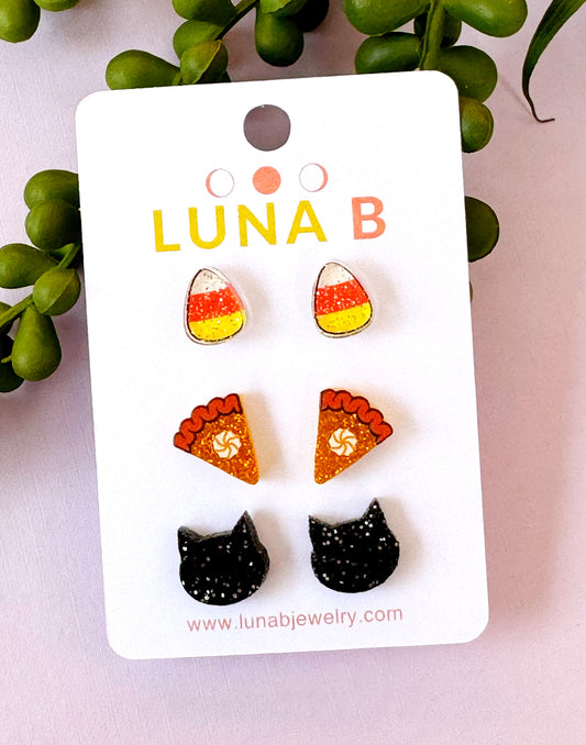 Halloween Stud Earrings Set – Candy Corn, Pumpkin Pie & Black Cat | Handmade Glitter Acrylic