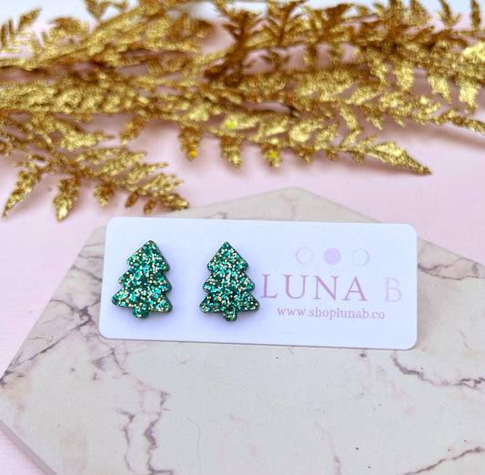 Green Christmas Tree Post Earrings – Sparkly Holiday Acrylic Jewelry