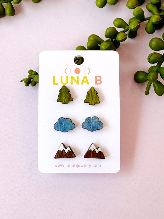 PNW Adventure Stud Earrings Set – Trees, Clouds & Mountains | Laser Cut Wooden Jewelry
