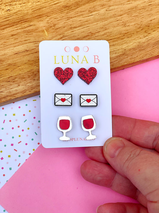 Valentine's Day Three Pack of Stud Earrings - Hearts, Love Letters, Red Wine