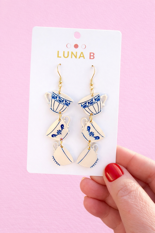 Stacked Teacup Earrings – Blue & White Porcelain-Inspired Statement Earrings | Handmade