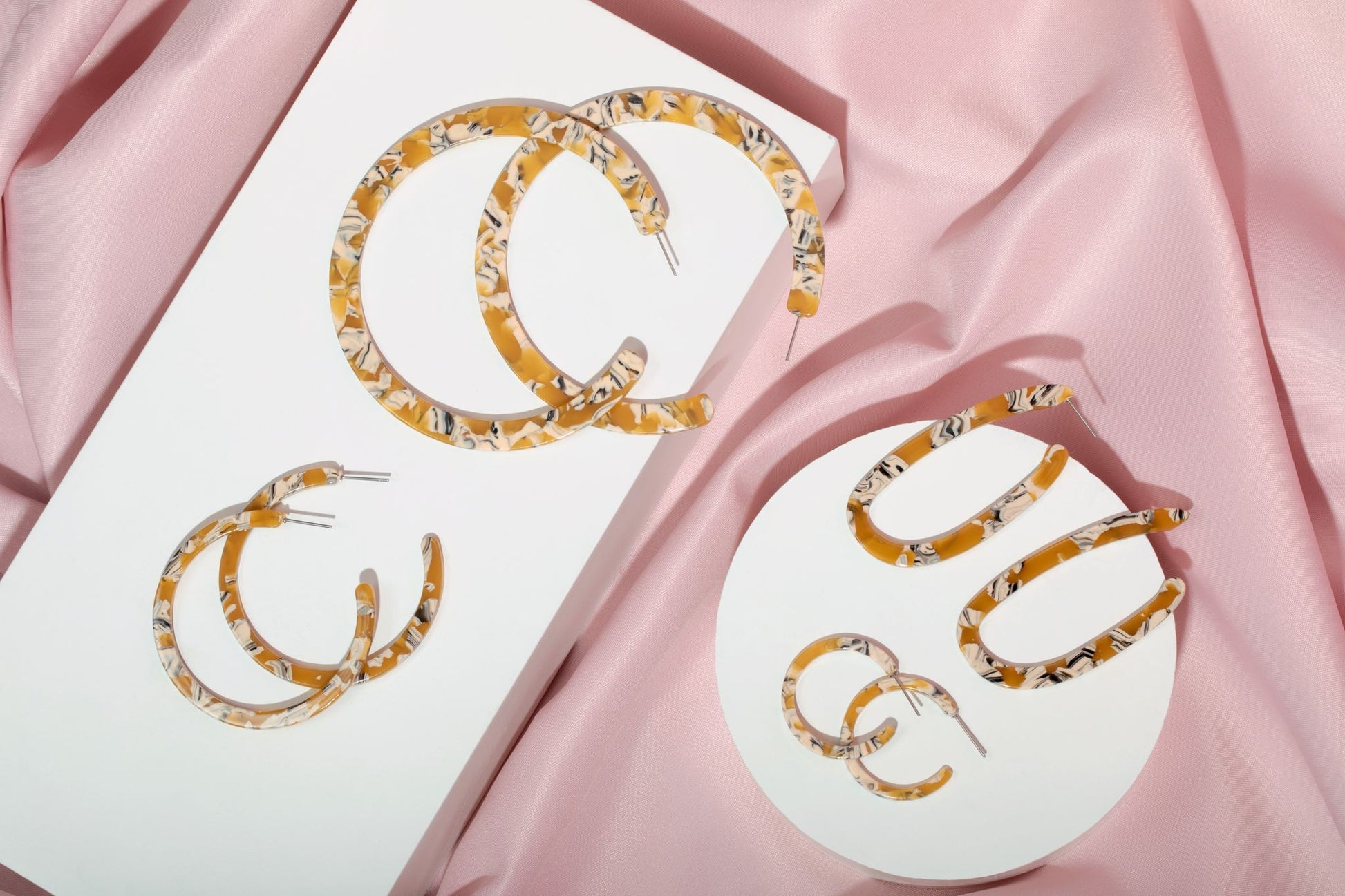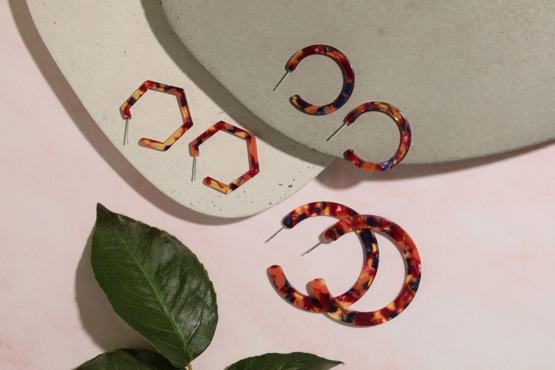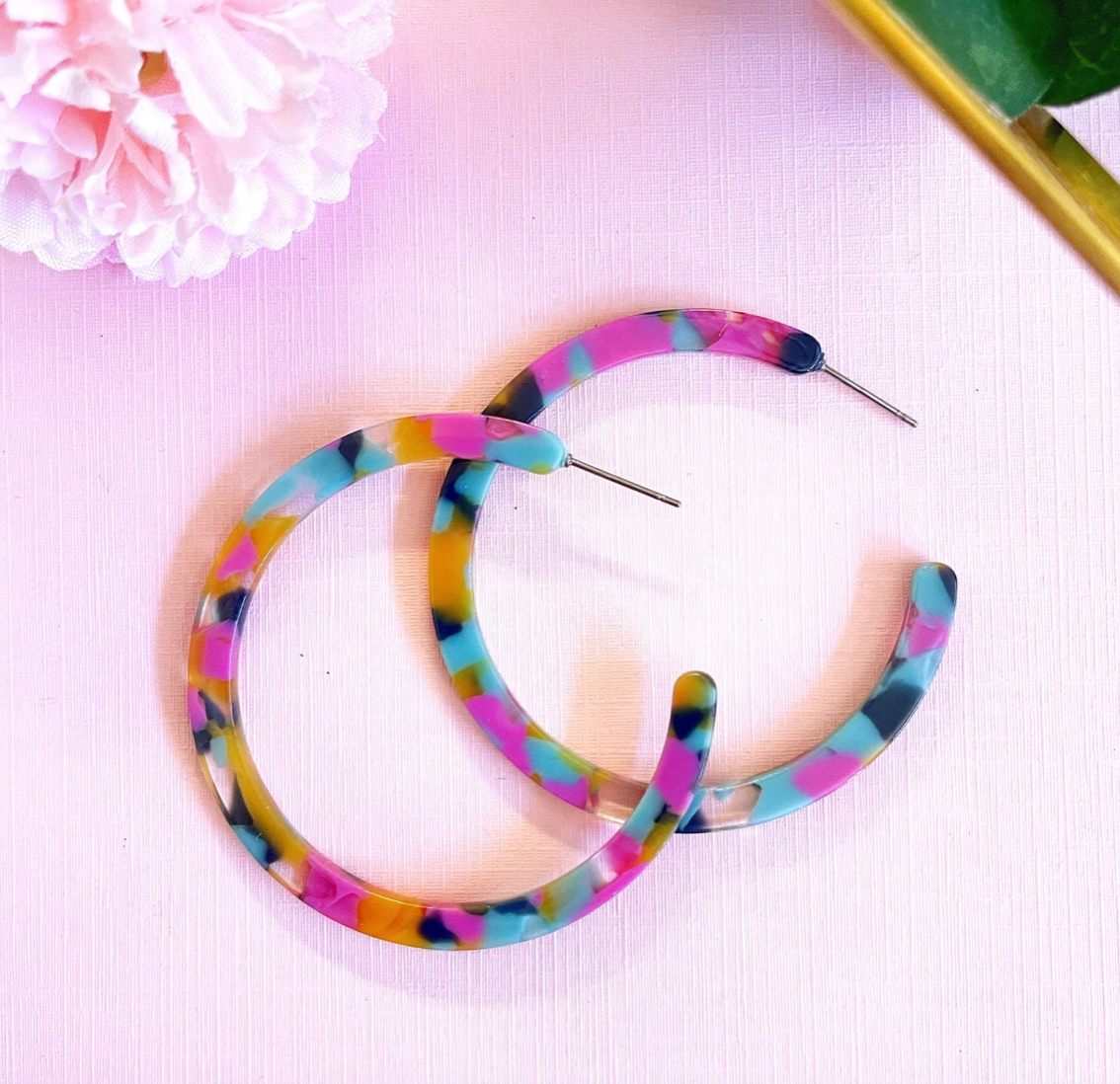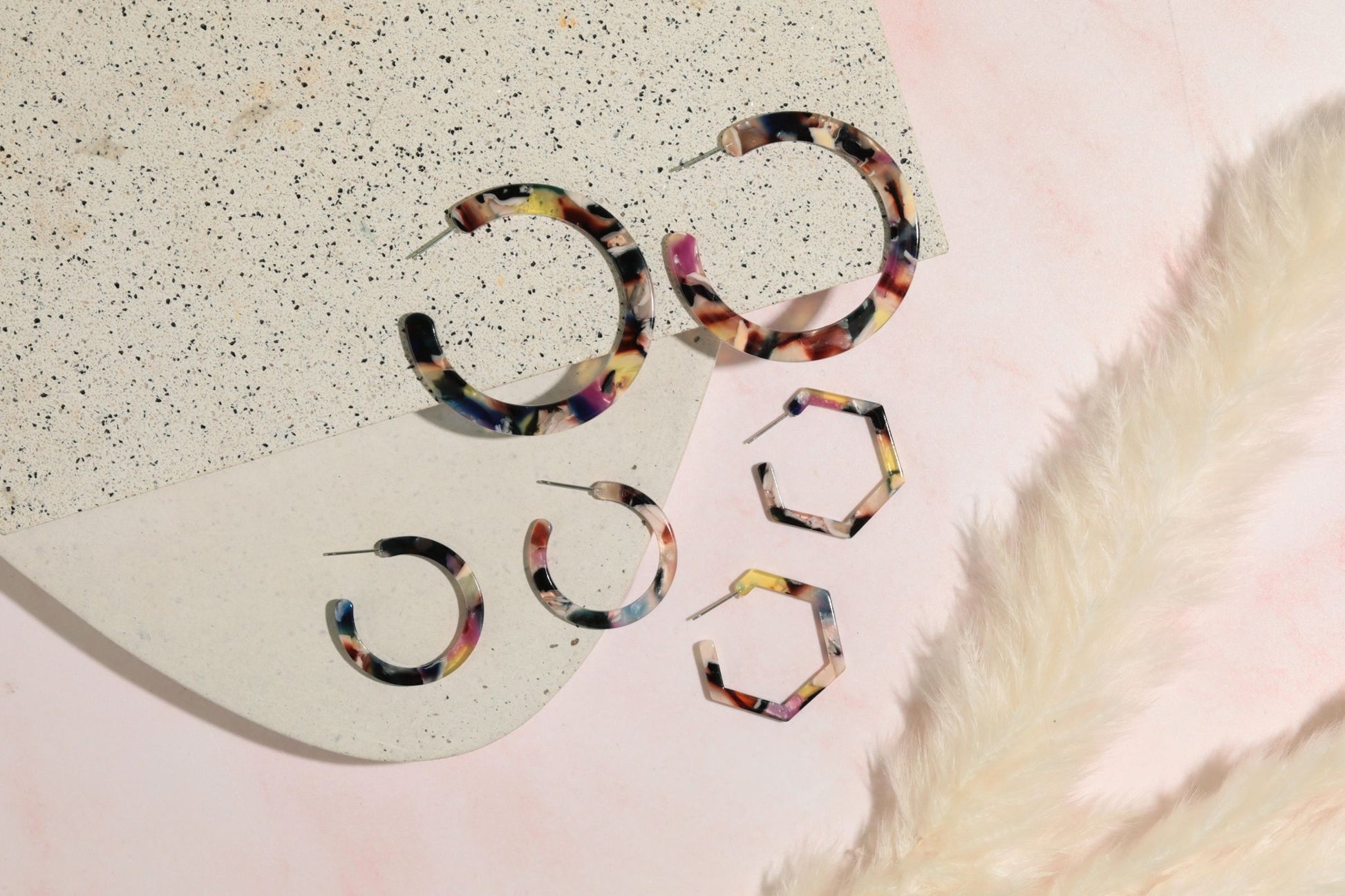 Unleash your inner diva with our stunning, feather-light acetate hoop earrings. Add a dash of glamour to your attire without denting your wallet or torturing your earlobes.