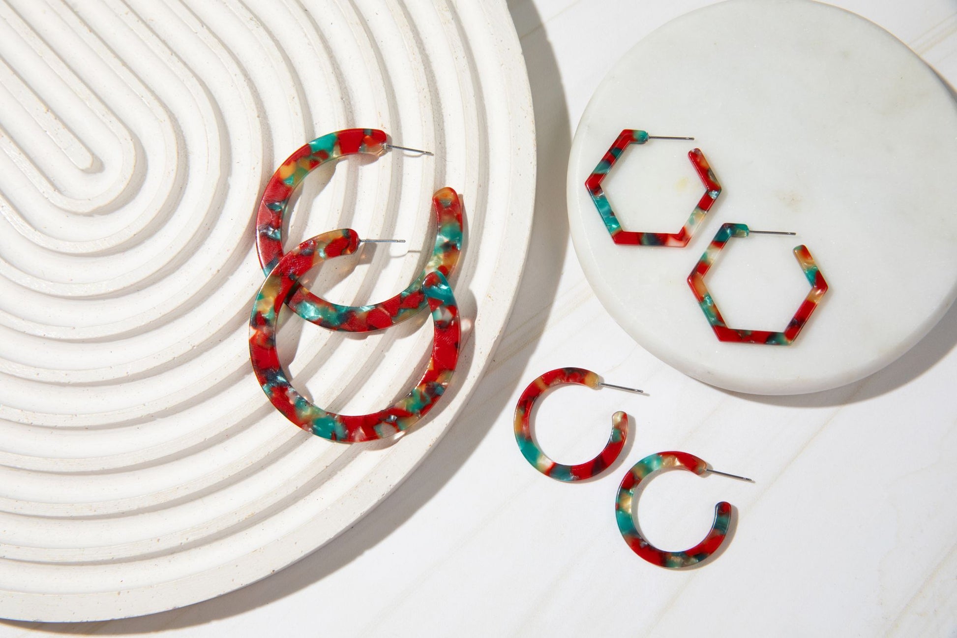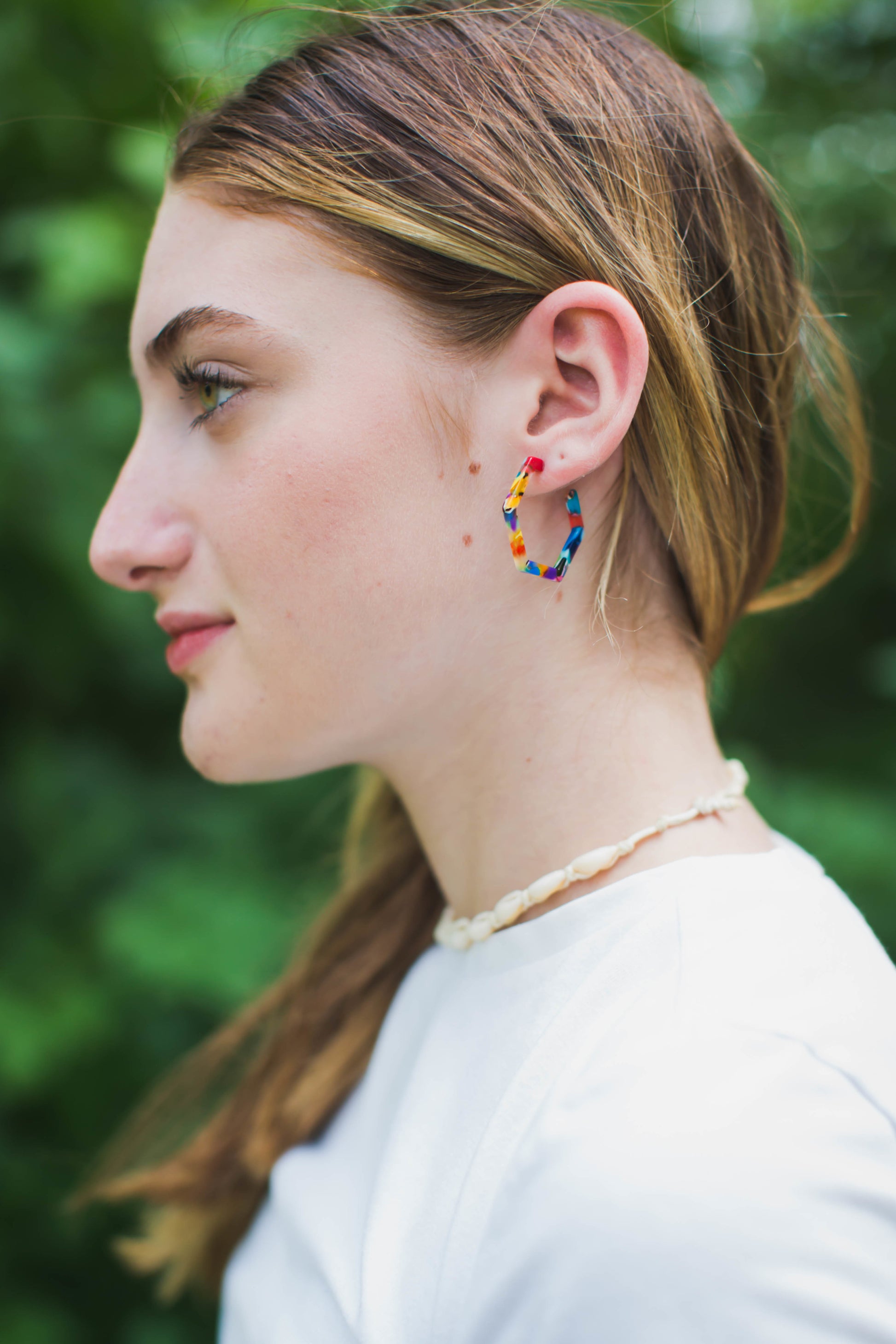 Brighten your look with our 35mm multicolor acetate hoops, designed with a bold geometric twist. These lightweight statement earrings are as comfortable as they are colorful — a perfect match for your everyday outfits, workdays, and happy hours alike.