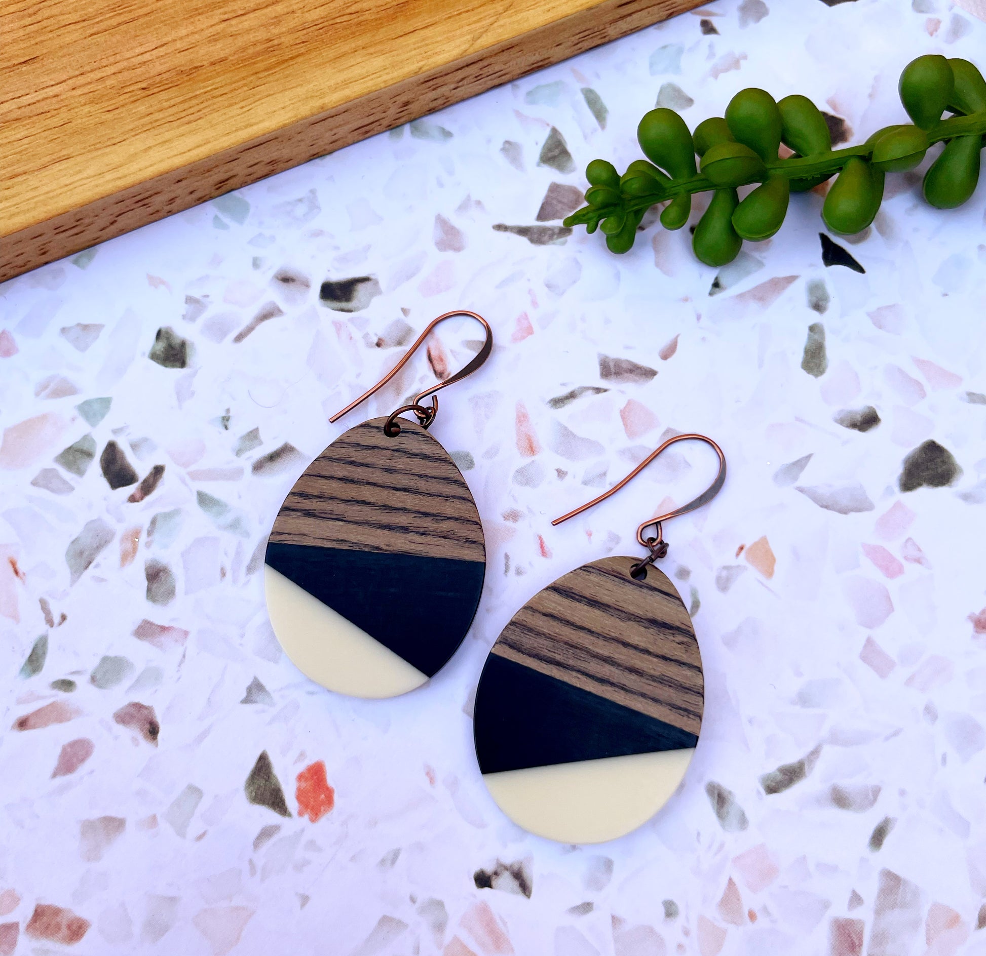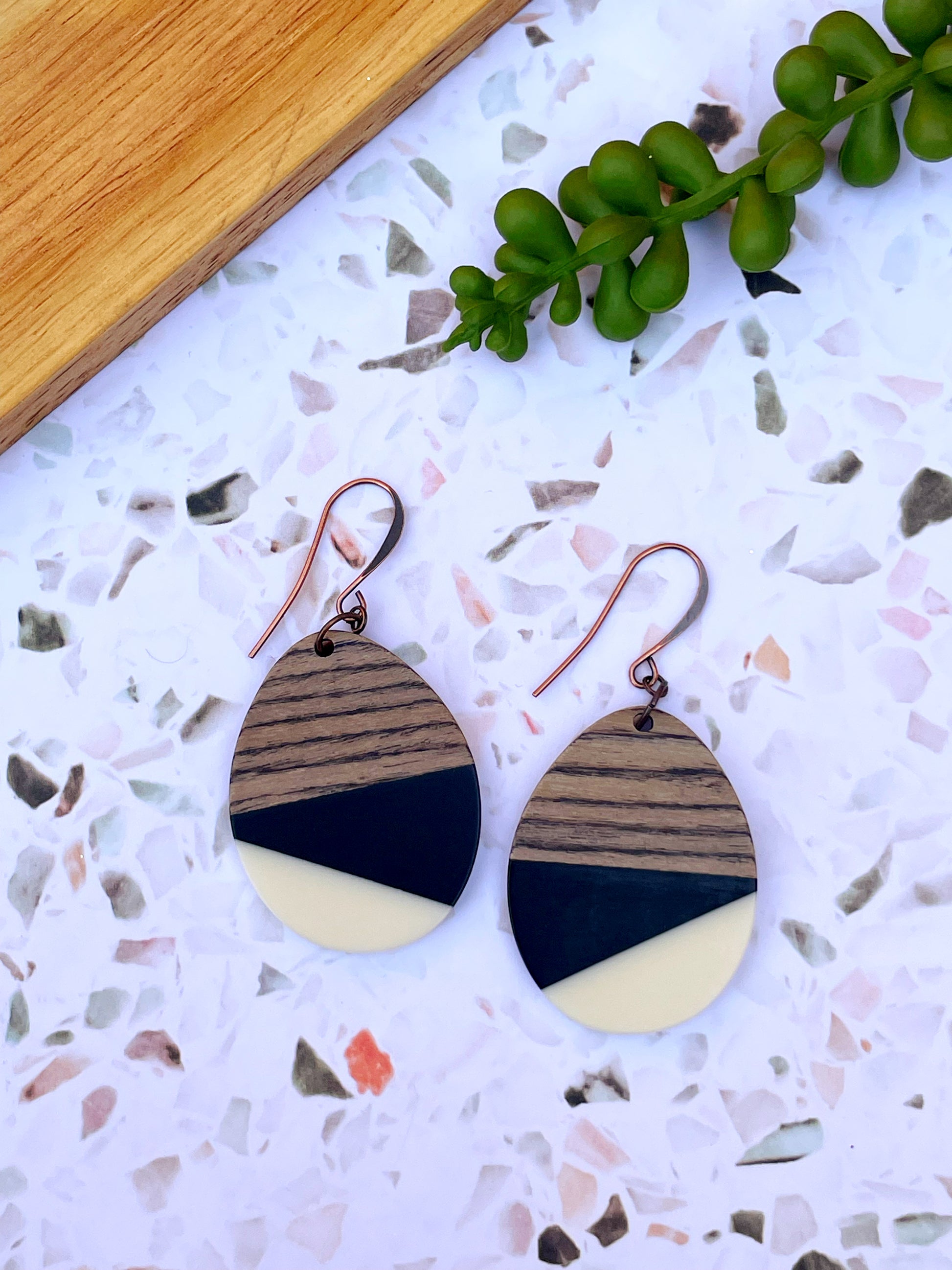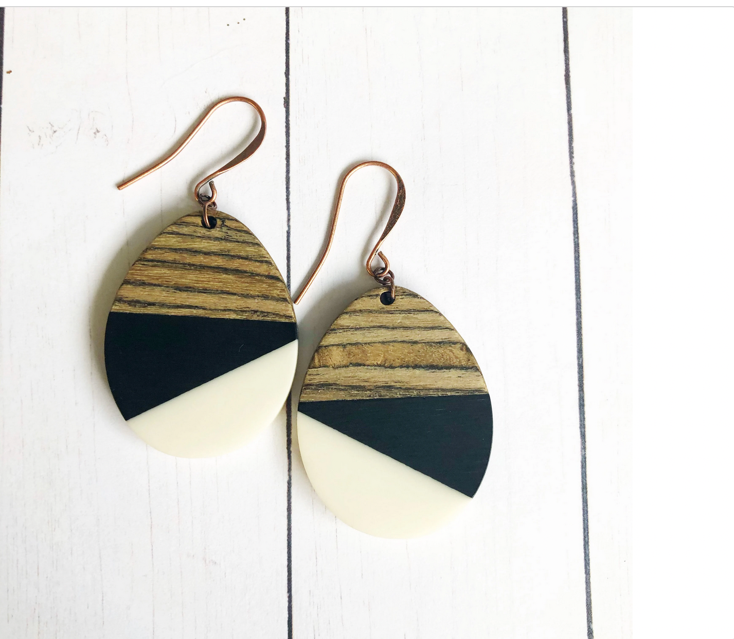 Black & White Wood & Resin Teardrop Earrings