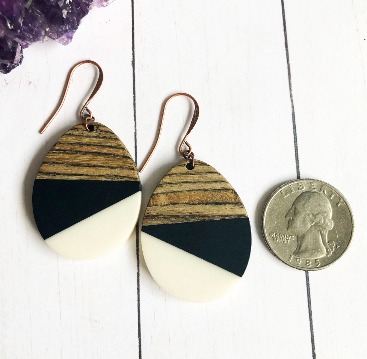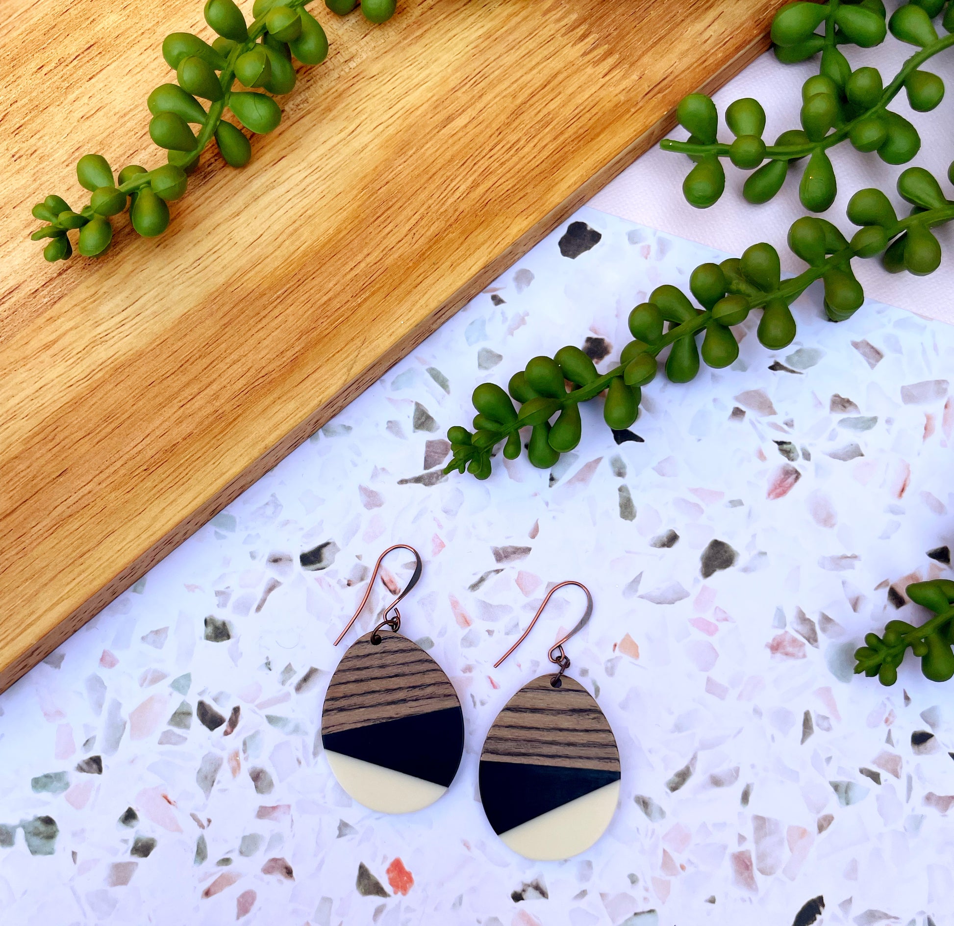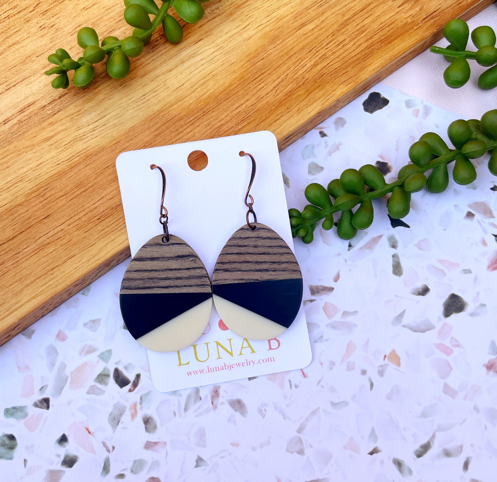 Black & White Wood & Resin Teardrop Earrings
