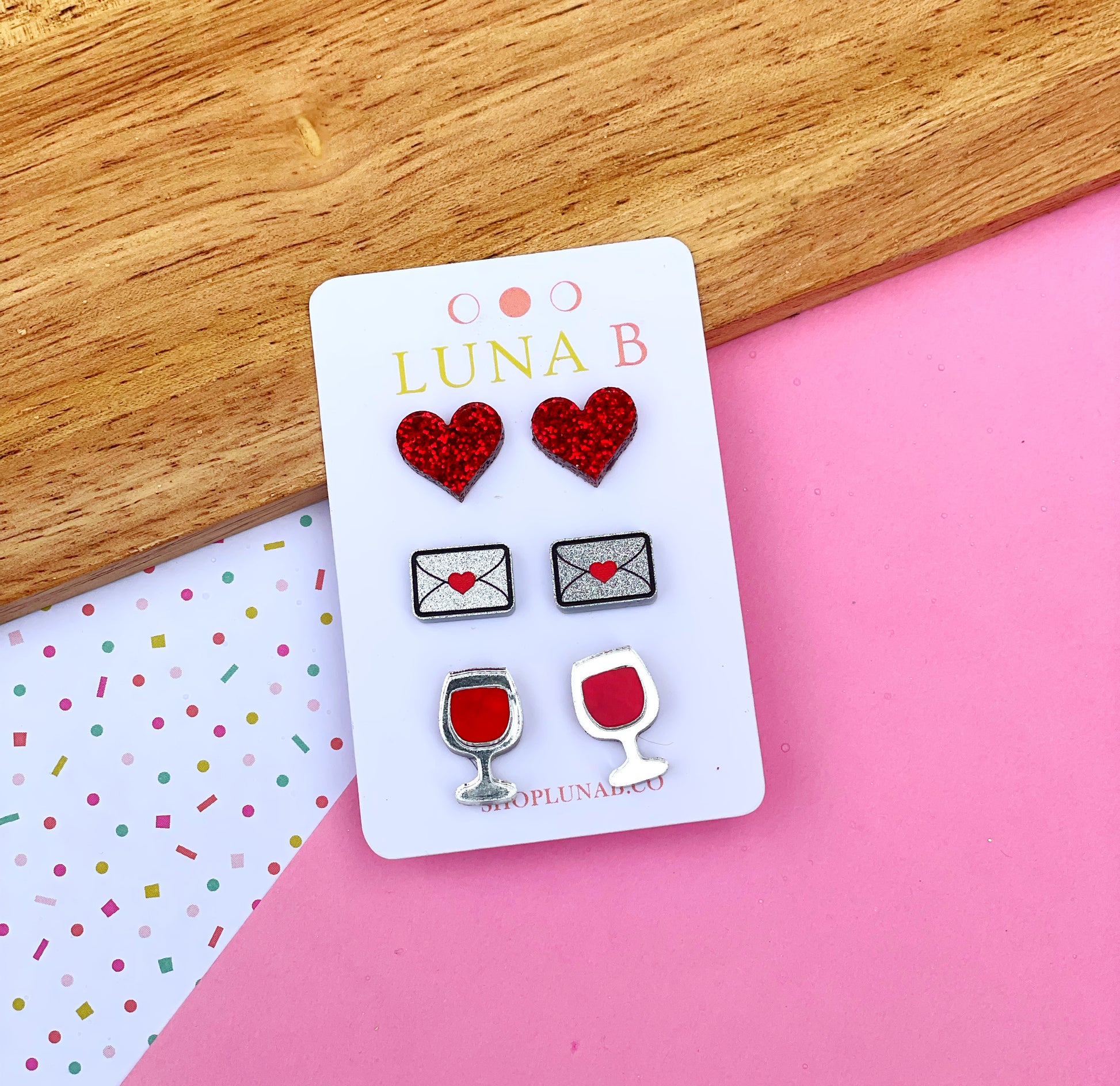 Treat your Valentine with a pack of red hot stud earrings featuring glittery red hearts, silver glitter love letters, and red wine glasses. Mix and match or wear whatever pair fits your current mood. All are laser cut acrylic and set on nickel free posts, so even your sweetheart with sensitive skin can feel fashionable this holiday season.