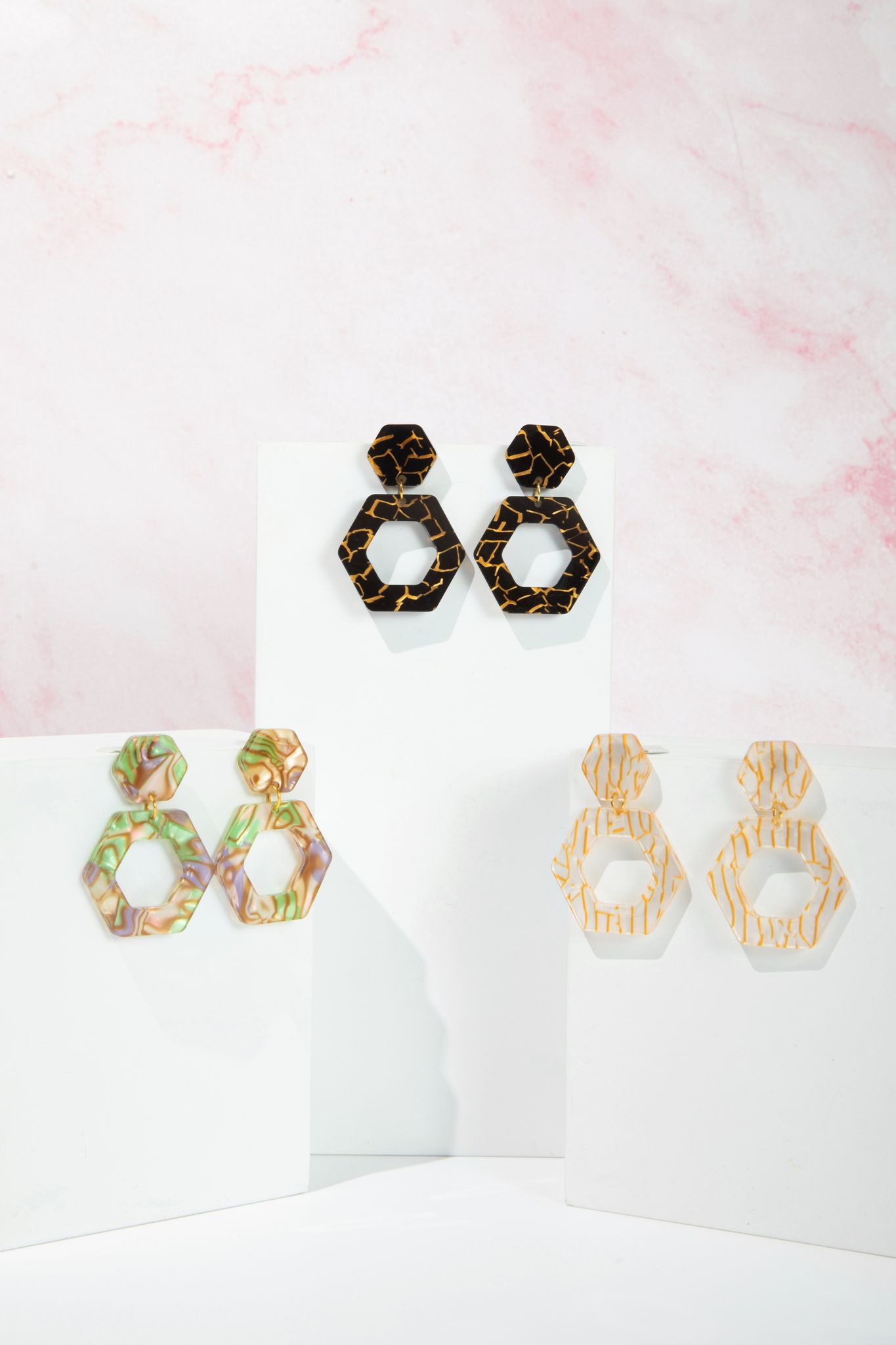 Snag a pair of our edgy hexagon earrings, available in classy black & gold, crisp white & gold, or the iridescent hues of abalone shell. With their flawless chicness, they're your ultimate day-to-night accessory. They're the Swiss Army knife of your jewelry collection - neutral but audacious, a geometric must-have that screams, "I'm too stylish to be square!"