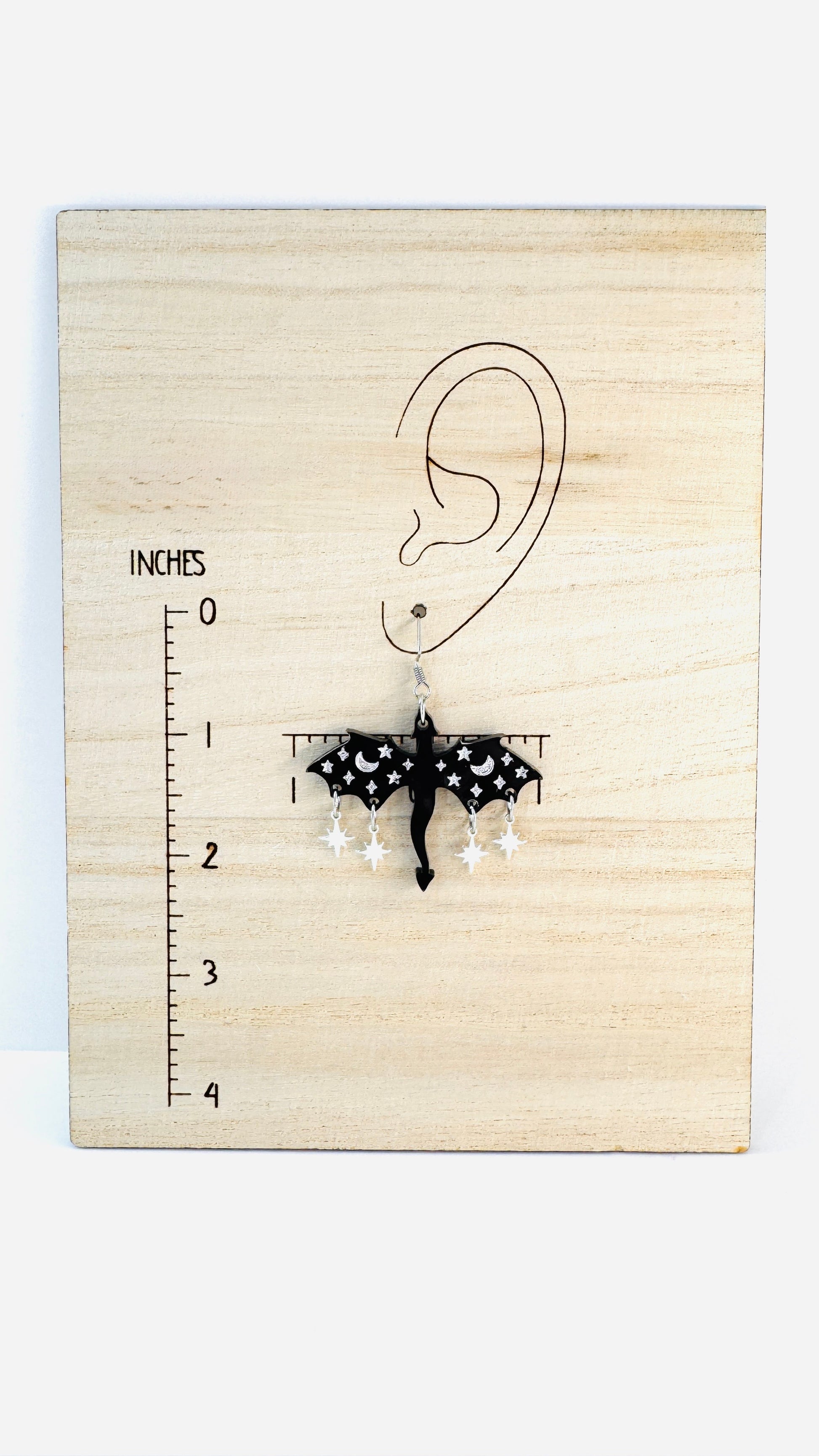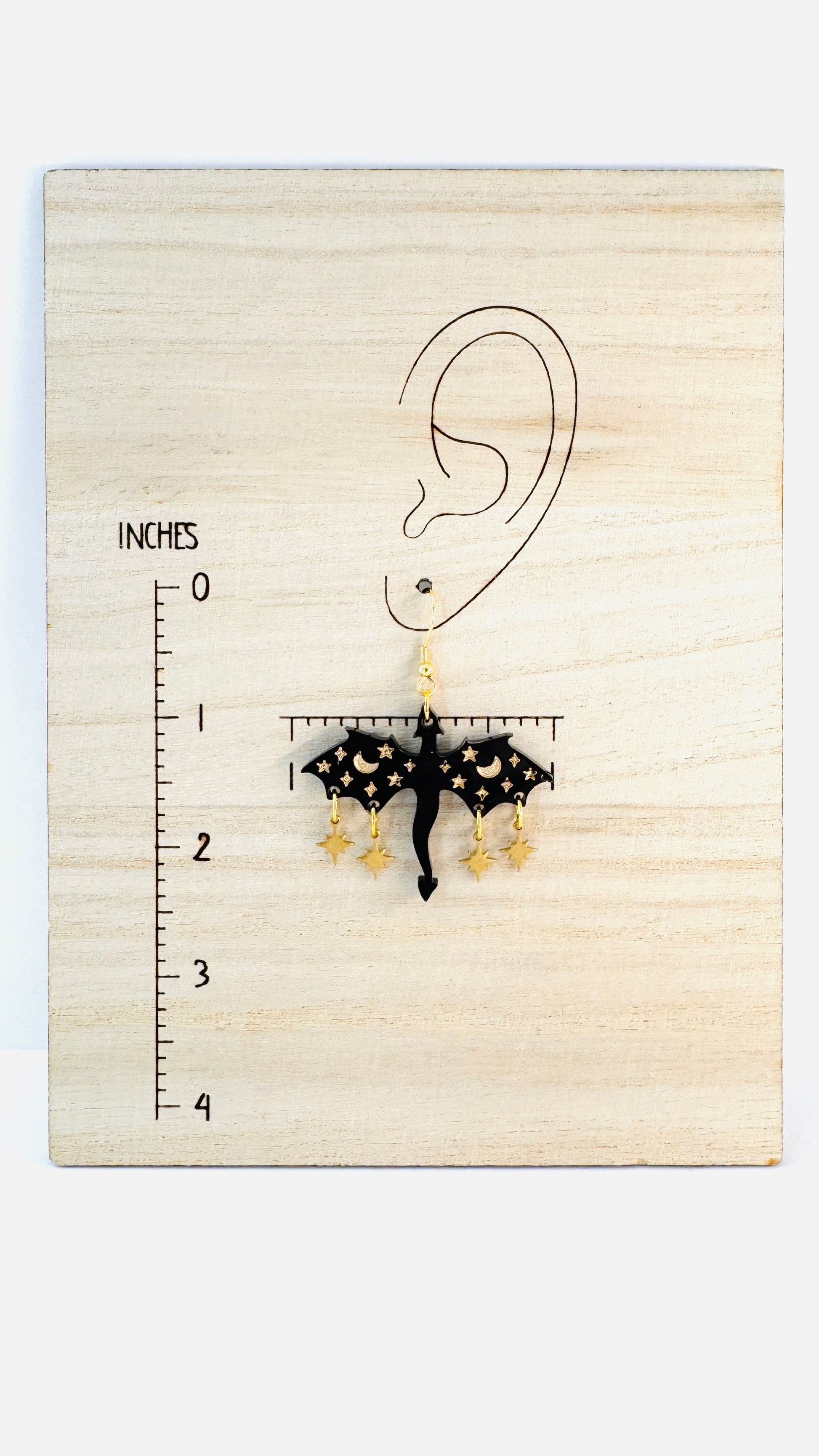 Unleash your inner dragon rider with these romantasy-inspired statement earrings. Crafted from pearlescent black acrylic, each dragon spreads its wings wide, adorned with shimmering moons and stars. Dangling star charms catch the light with every move, bringing a touch of celestial magic.