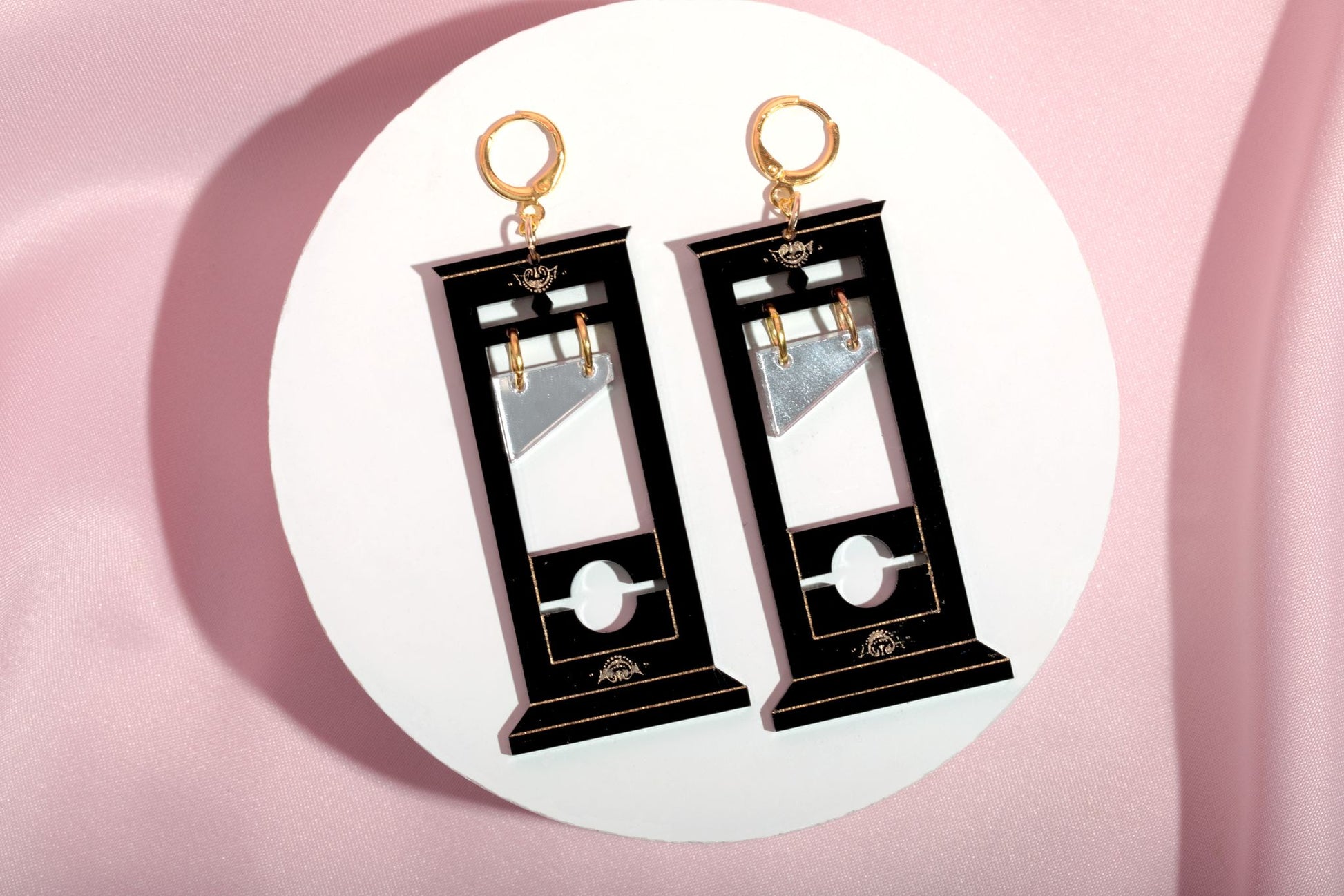Our Guillotine danglers, hand-crafted with the utmost precision and detail, dangle from high-quality, gold plated ear wires. Fashioned from laser-cut acrylic, they're engraved and embellished with a metallic sheen.