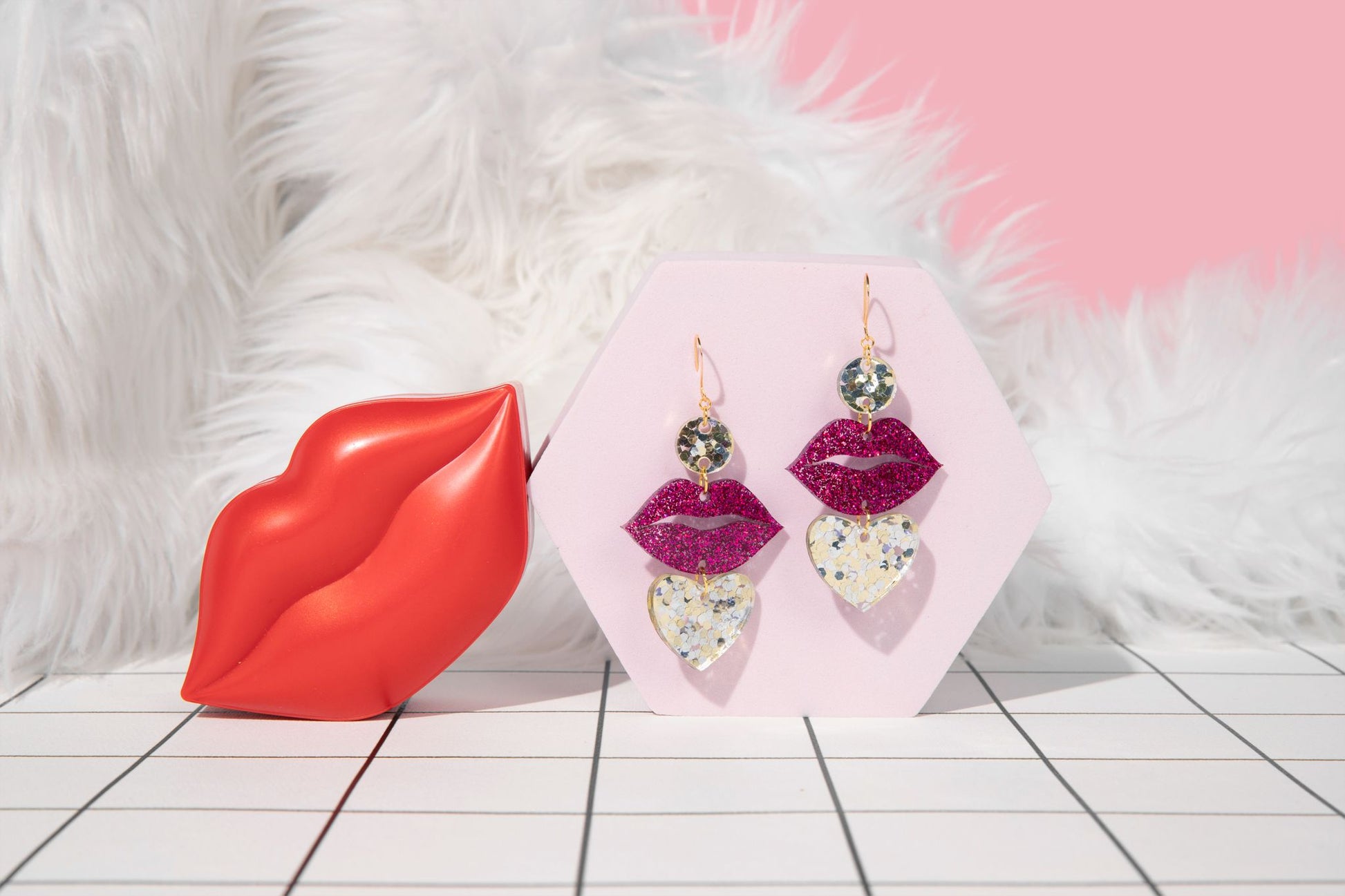These earrings are the ultimate blend of sass and sparkle. Raspberry glitter lips meet champagne hearts, creating a pair that's nothing short of a showstopper.