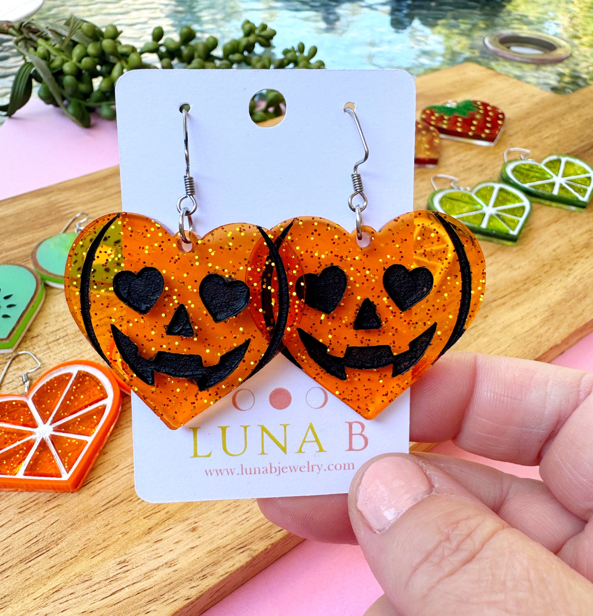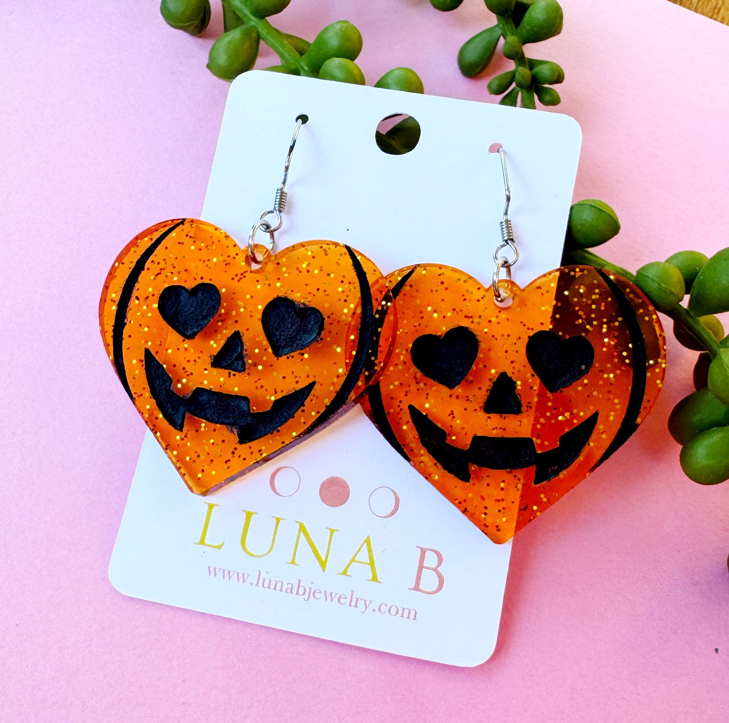 These glittery orange hearts feature hand-painted jack-o’-lantern faces with heart eyes (literally), layered acrylic for that classic Luna B pop, and stainless steel hooks for comfy, all-day haunting. They’re handmade, high camp, and totally scream summerween queen.