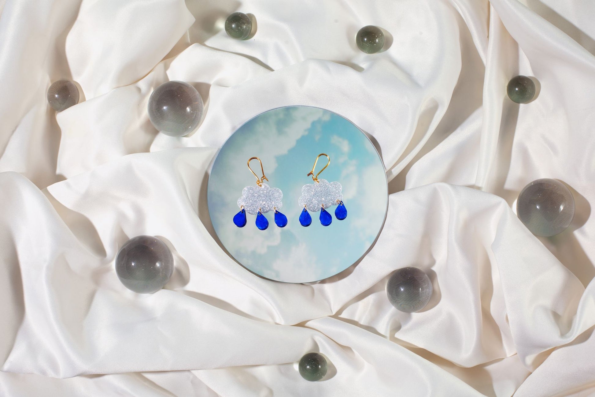 Don't let a little drizzle dampen your style! With these sparkling silver cloud earrings paired with dazzling blue raindrops, you'll be the one summoning the storm of compliments. Perfect for both, dancing in the rain or a sunny strut, they're a testament to your unclouded love for all weathers.