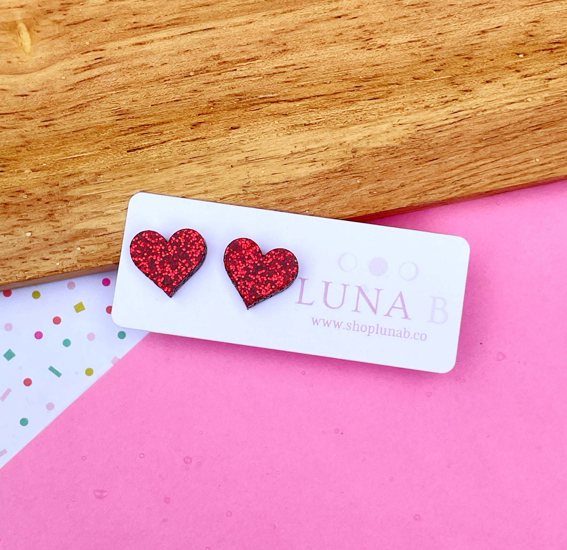 Simple, yet festive - these red glitter hearts are as sparkly as your love. Crafted with precision in our very own Luna B studios, these little beauties are more than just eye candy. Set on nickel-free studs, they promise comfy wear without a care. So, go on, make it a Valentine's to remember.