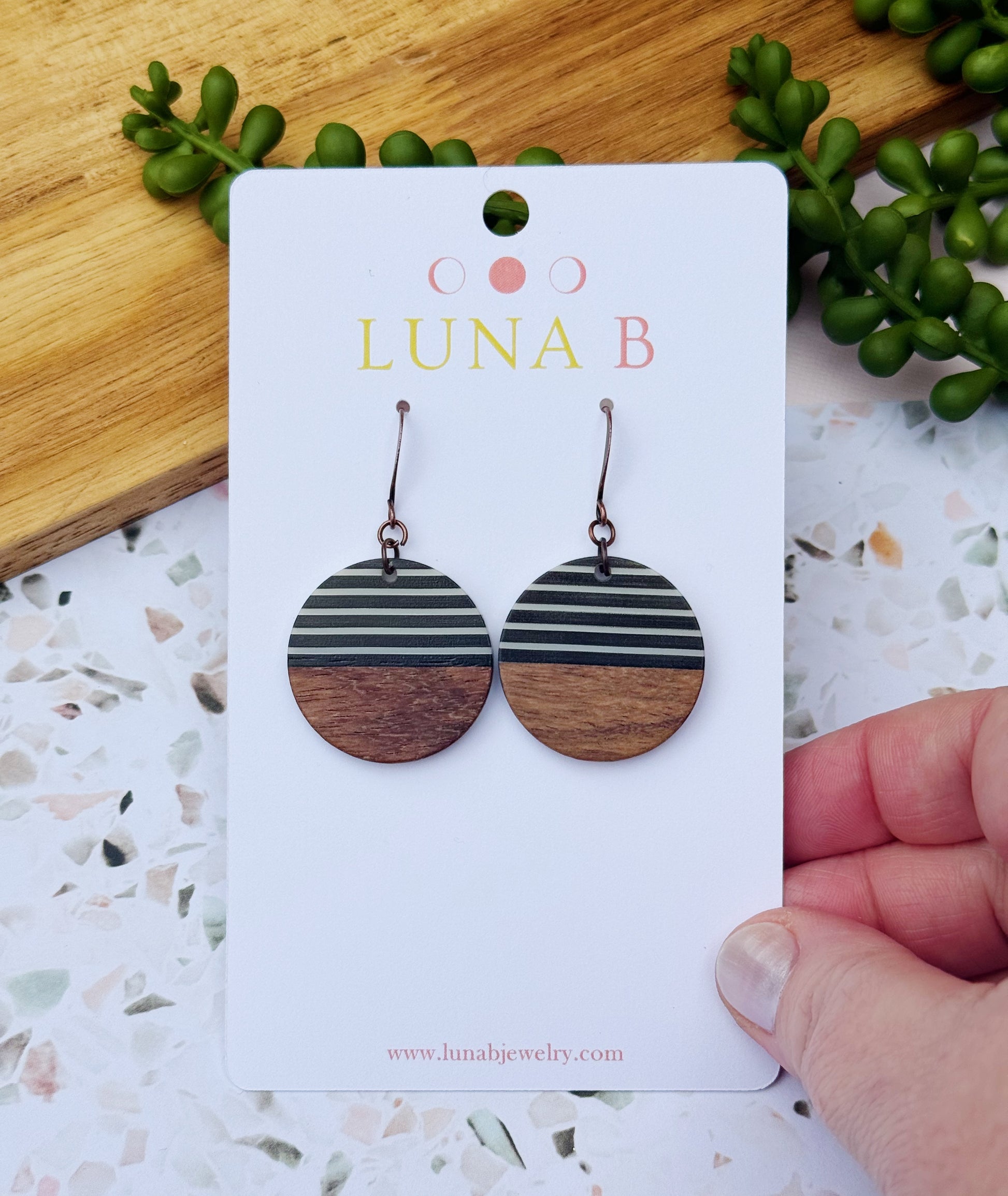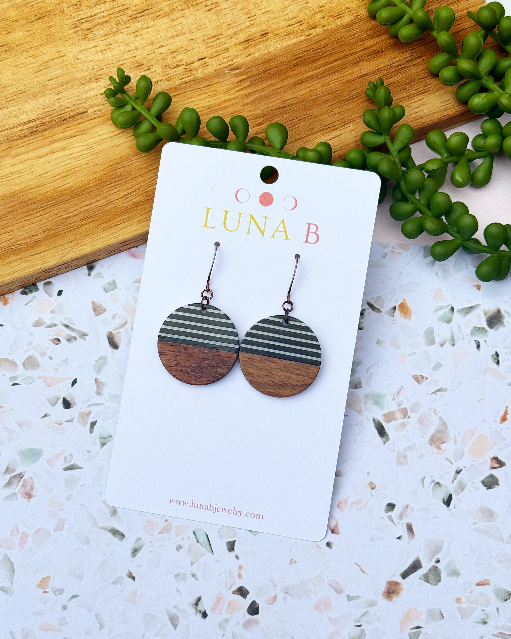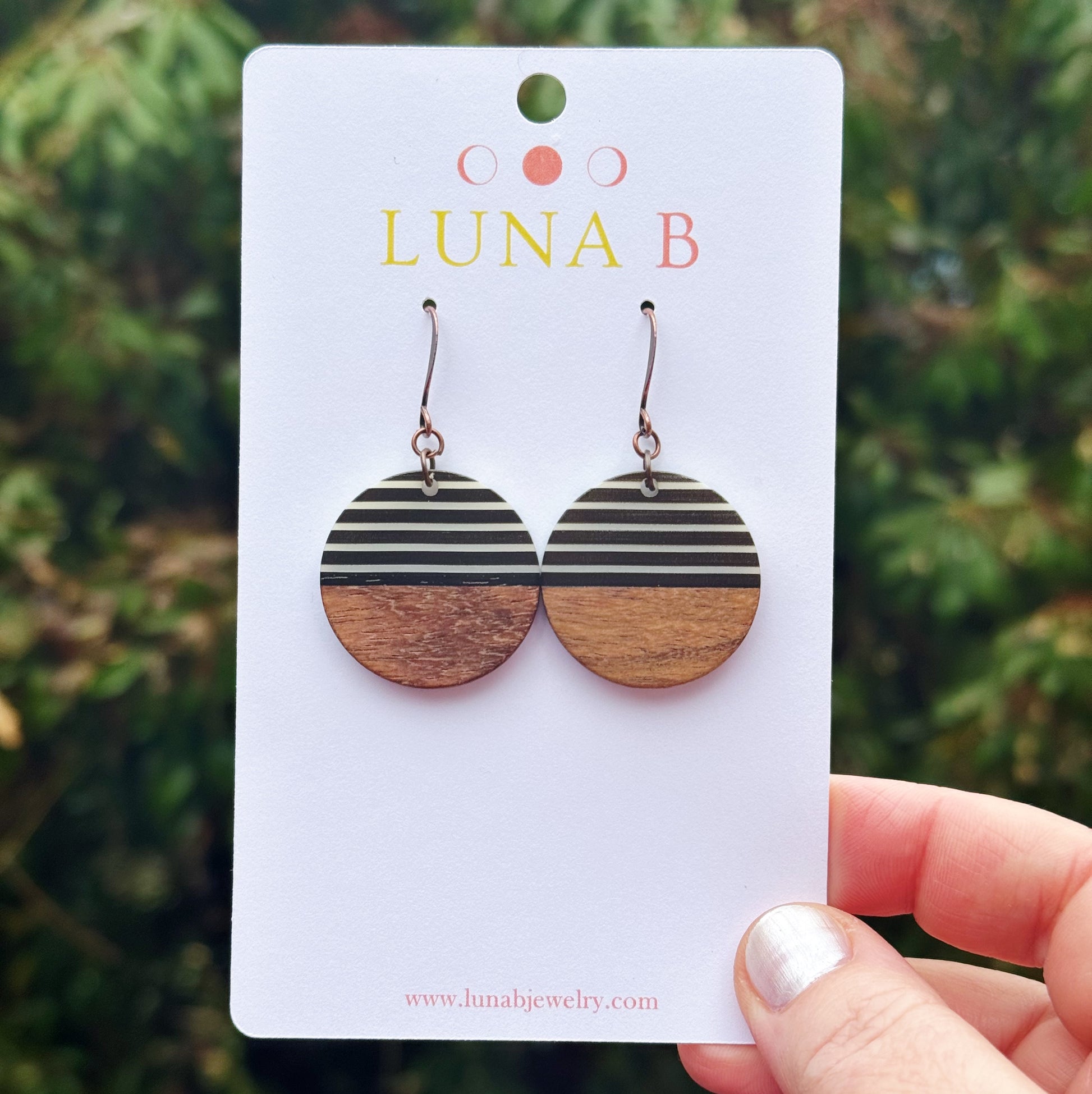 Simplicity, meet style. These earrings are your go-to for a classic yet casual look. Crafted from wood and resin coins, they sport a chic black and white pinstripe design. Perfect for taking you from office hours to beach vibes in a blink.