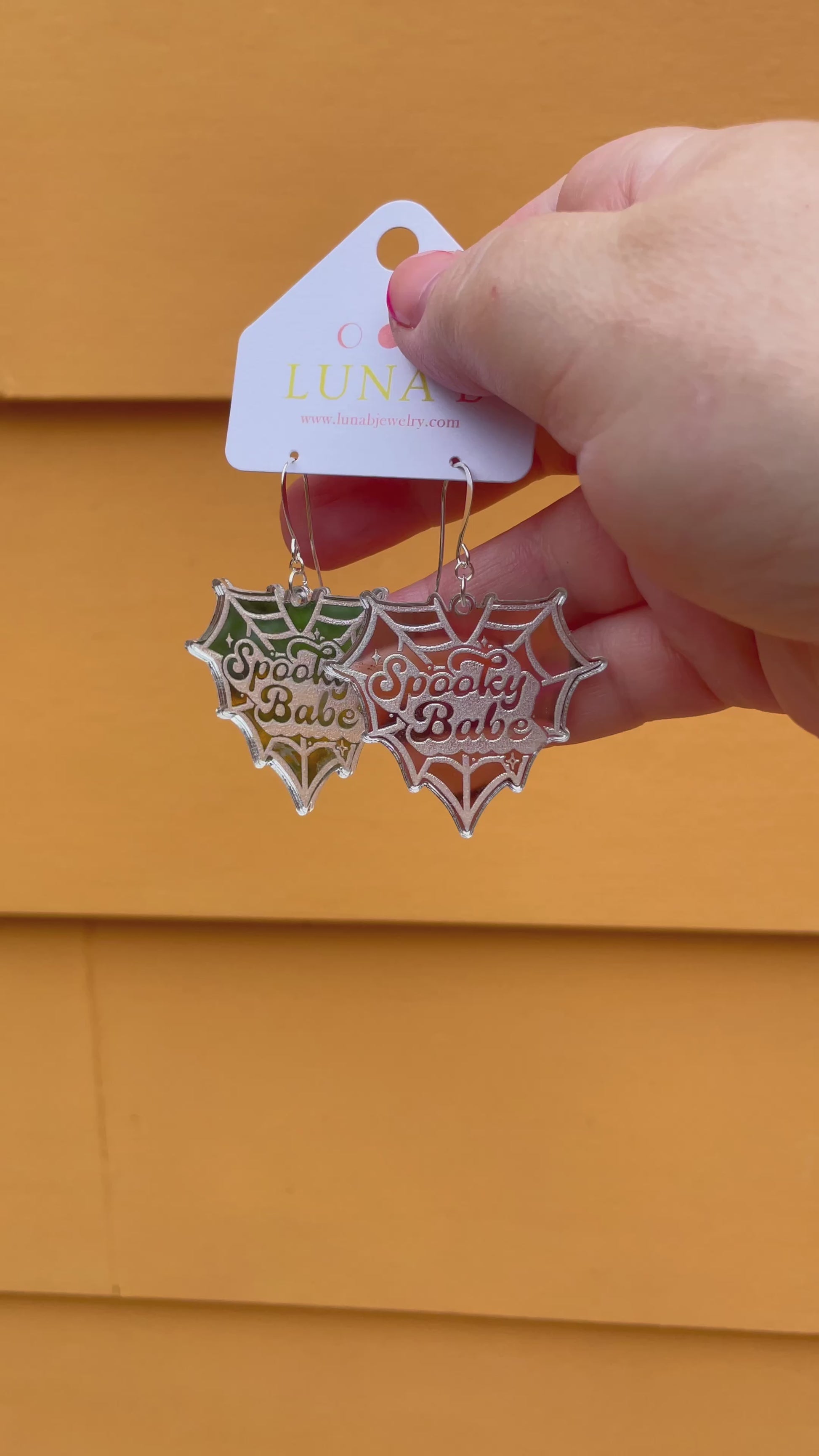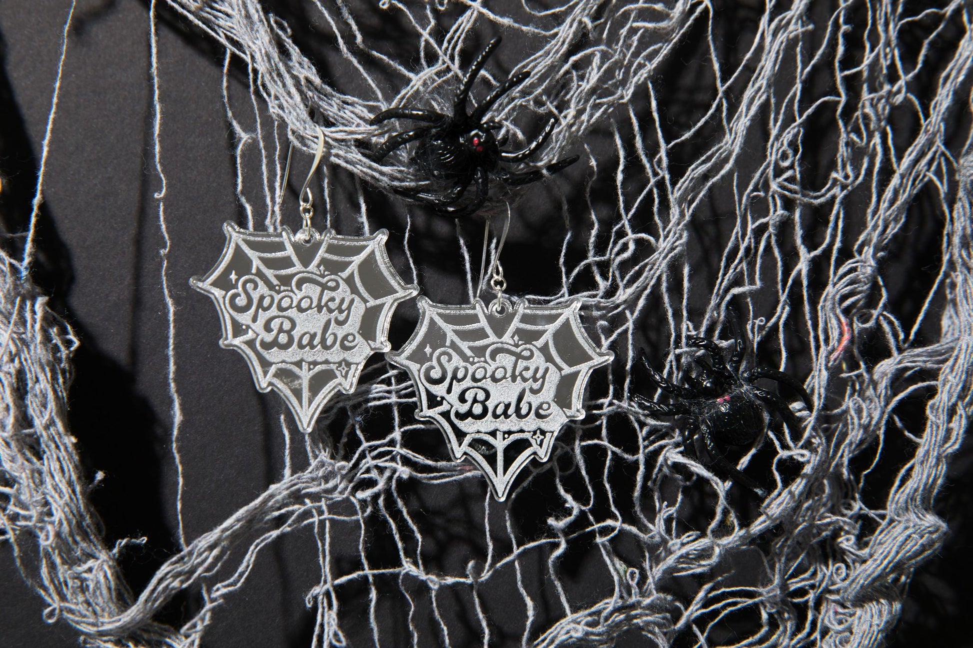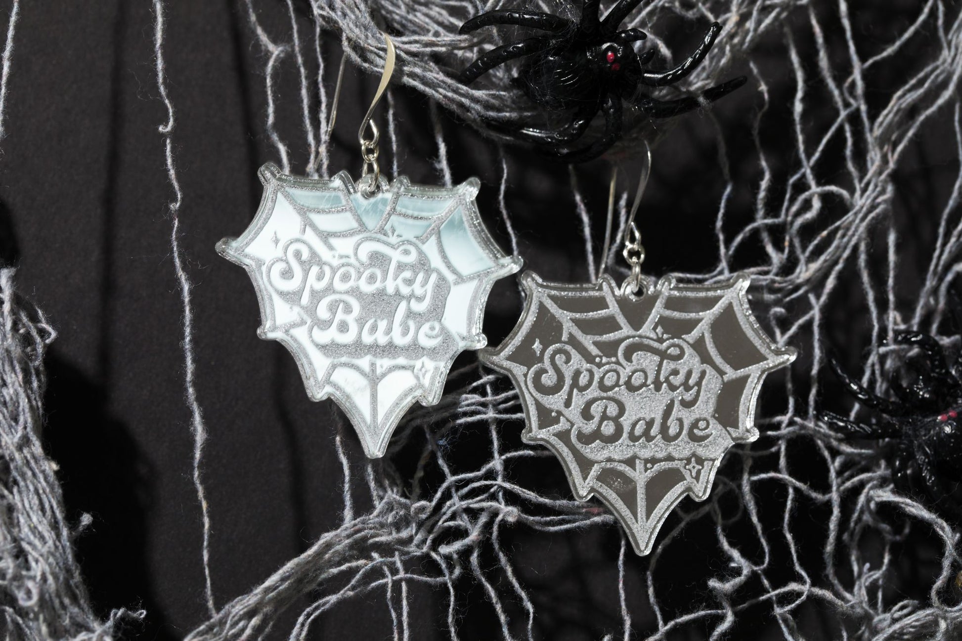 Tell the world you're a Halloween queen with these bold and beautiful Spooky Babe spider web earrings! Made from laser-engraved silver mirror acrylic, these lightweight dangles shimmer with just the right amount of spooky glam.