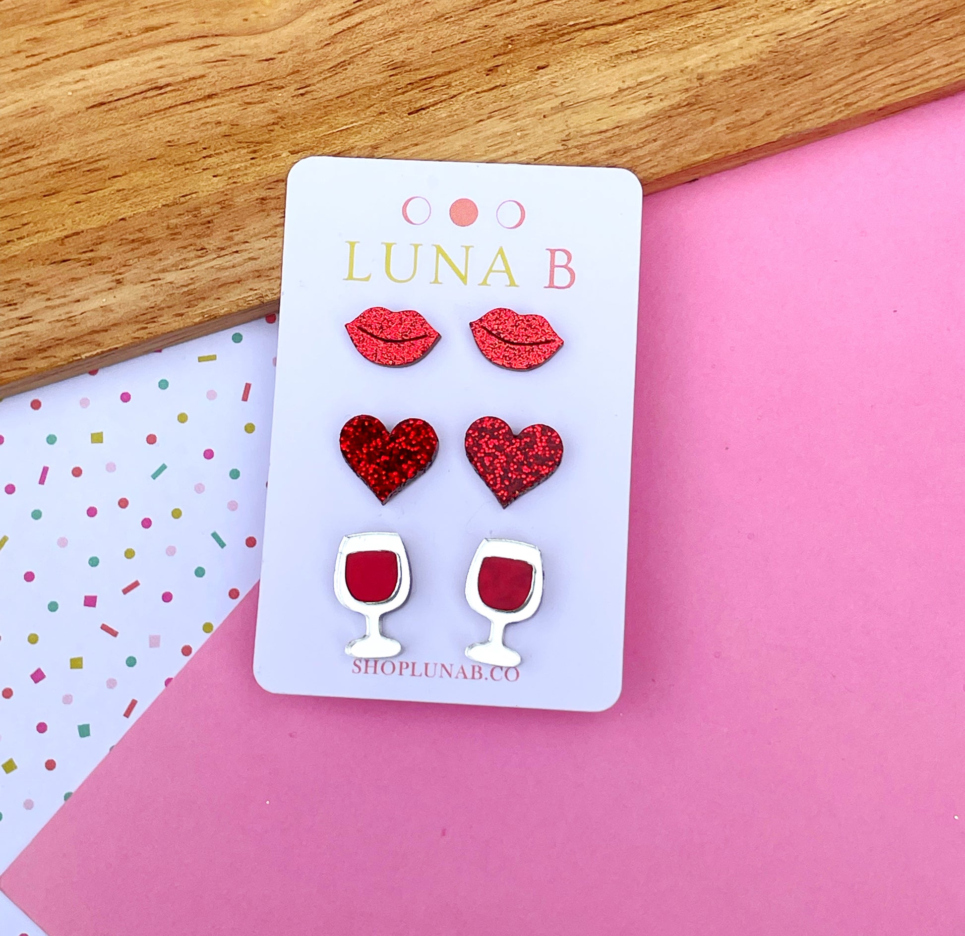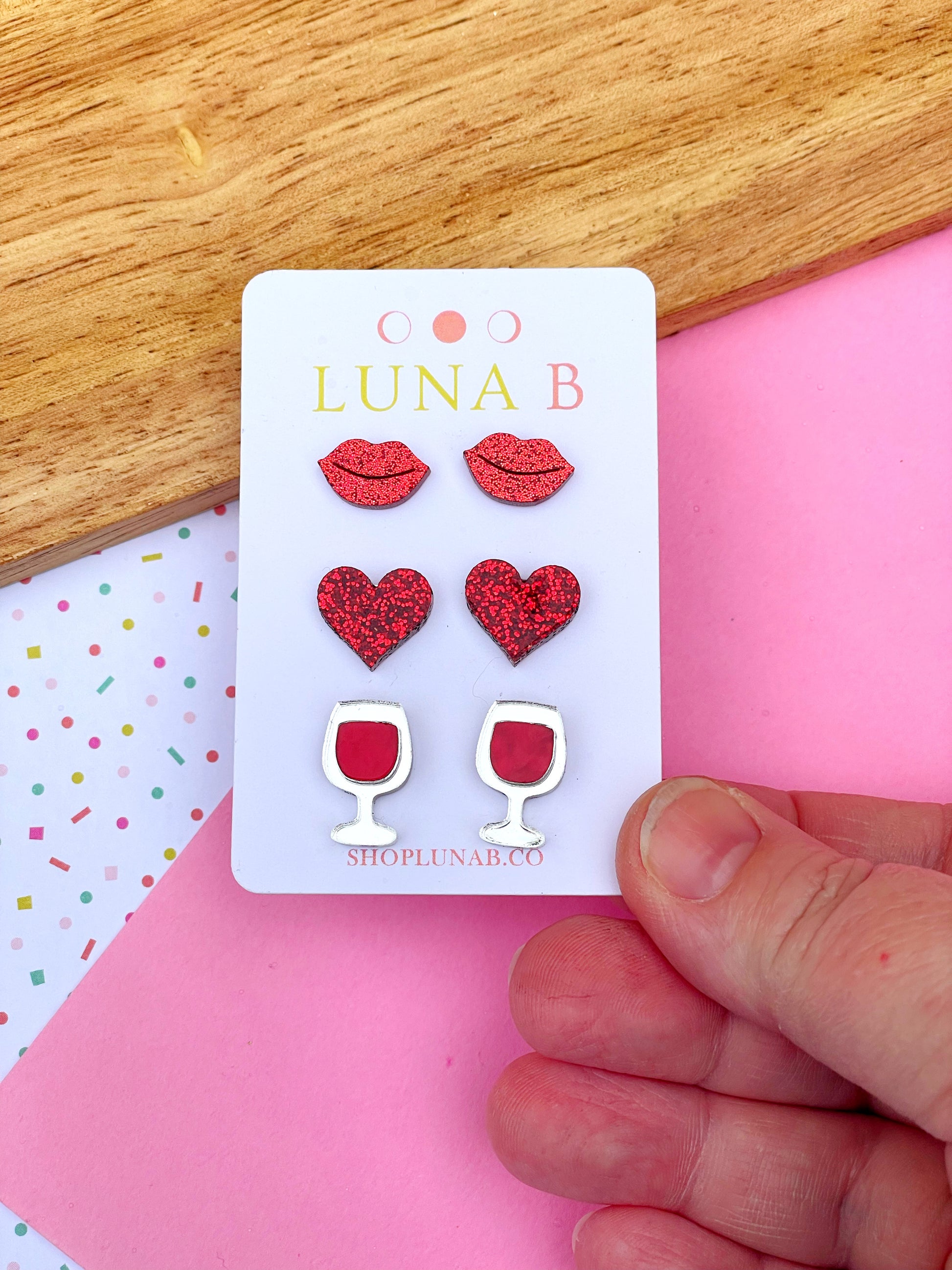 Valentine's Day Three Pack of Stud Earrings - Lips, Hearts, Red Wine